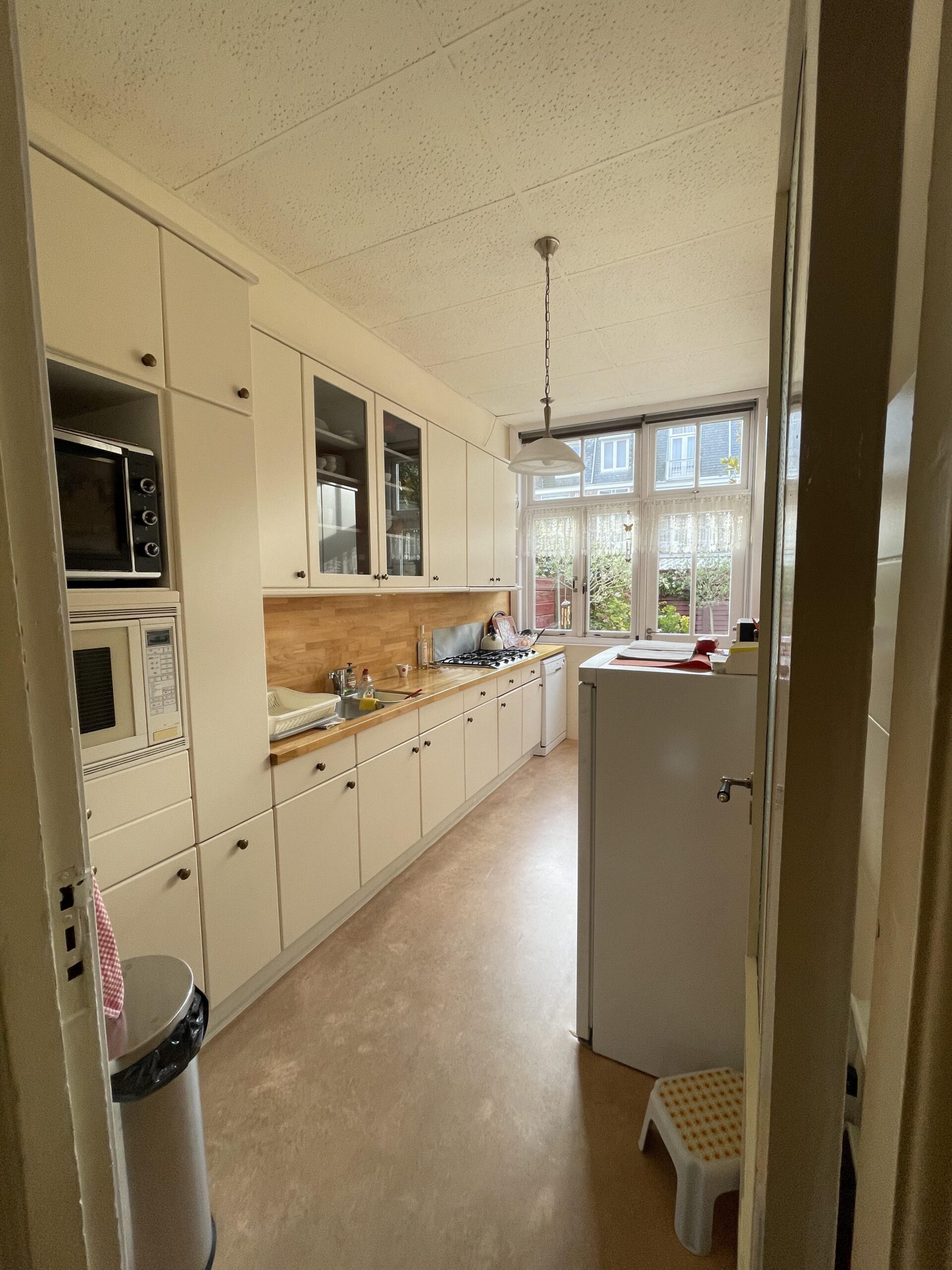 Op de eerste verdieping zijn alle verlaagde plafonds verwijderd en kwam het mooie originele ornamentenplafond weer te voorschijn. De badkamer wordt vernieuwd. In de voor- en achterkamer is vloerverwarming aangelegd.